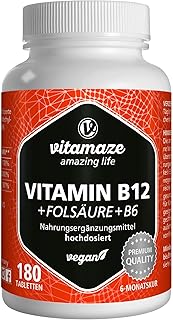 Vitamine B12 à Fort Dosage avec Acide Folique + Vitamine B6 Méthylcobalamine, 180 Comprimés Vegan, Utilisation Sublinguale Possible, Qualité Allemande, sans Additifs Inutiles
