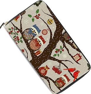 Portefeuille en cuir pour femme avec poche zippée Motif oiseaux de Noël chouettes et arbre